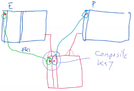 Composite key - is a primary key that is made up from many attributes to create a unigue identifier. Each attribute makes up the key. Often found in a junction table to manage a many to many relationship